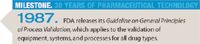So began the start and evolution of validation practices and technologies to the seemingly complex set of rules and guidelines used by industry today. Publications of the late 1970s and early 1980s, particularly those of the Parenteral Drug Association (PDA), introduced the concept of qualification and validation to the industry at large. Companies began to qualify and validate their sterilization processes initially, and then applied these same validation principles to other systems. With FDA's 1987 Guideline on General Principles of Process Validation, the validation of equipment, systems and processes became widespread and mandatory as manufacturers of all drug types were alerted to FDA's expectations for process validation (5).