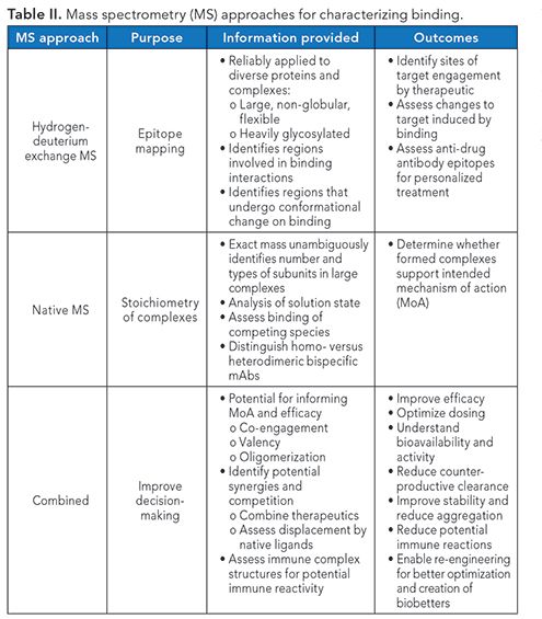 The two key MS approaches for characterizing binding and MoA are hydrogen deuterium exchange (HDX) MS and native MS (see Table II).