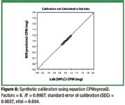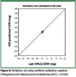 Figure 8 shows the NIR predicted CPM concentrations versus the HPLC results for each tablet in the calibration set using the synthetic calibration equation CPMsyncal2. The other five tablets scanned (tablet 6a through tablet 10a) on the MasterLab instrument with nominal levels of 1.0 mg CPM, that were not in the calibration set, were predicted for validation. Figure 9 shows the NIR predictions of the validation set versus the Lab (HPLC) CPM value. Table II shows the predicted values for the validation set. The standard error of prediction (SEP) of the validation set compared with the HPLC data was 0.0104 mg and the bias was 0.0139 mg. The SEP is significantly larger then the SEC because the synthetic calibration samples have reduced error except for the "seed" samples. The SEP is low at only about 1% of batch label claim.