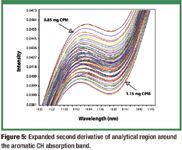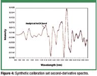 Figure 5 shows the expanded second derivative of the aromatic CH stretch analytical band demonstrating the fanning out from 0.85 mg to 1.15 mg CPM (adjusted to 0.875 mg to 1.1838 mg from HPLC analysis). Table I shows real tablet values and the fractional adjustment that was made using the mean tablet value. The adjusted values are the constituent values that were used for modeling.