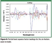 Figure 6 is a plot of the principal component loadings around the 1138-nm absorption band for CPM. The loadings appear spectra-like and are not noisy, indicating good modeling attributes for the factors chosen. The loading indicate regions of high correlated variance throughout the spectrum for each factor. Figure 7 is a plot of the PRESS. The model chosen used only six of these factors, trading decreased error for robustness (4). The PRESS for six factors was 0.0012. The resulting model had a multiple correlation coefficient (R2) value of 0.9987 and a standard error of calibration (SEC) of 0.0037 mg. The one-left-out cross validation demonstrates good predictability with a standard error of cross validation of 0.004 mg (very close to the SEC).