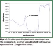 Ten chlorpheniramine maleate (CPM) tablets of nominal 1.0 mg and 10 placebo tablets of the same excipient composition were scanned on the MasterLab transmission instrument. The tablets from a 1.0-mg CPM batch were sent for HPLC analysis after NIR scanning. The spectra of the first five of the 1.0 mg tablets were averaged, and the placebo spectra were averaged. The other five tablets measured were saved for a validation set. The average placebo spectrum was subtracted from spectrum of the average of the five 1.0-mg tablets in the FOSS Vision software. This resulted in a simulated transmission spectrum of pure CPM. This spectrum could not be obtained in transmission because the pure CPM would have had to be pressed as a tablet.
