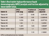 Table I: Real tablet high performance liquid chromatography (HPLC) analysis and fraction adjusted by mean tablet value.