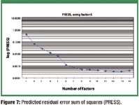 Partial least squares (PLS) regression was used to develop the prediction model. PLS uses principal component analysis and is a variation of principle component regression (PCR). The correct number of principal components or factors determination is aided by the Vision software supplied with the instrument by calculating where the predicted residual error sum of squares (PRESS) reaches a minimum (3). Although the PRESS does not reach a minimum until 13 factors, 6 were chosen as optimal allowing more than 10 calibration samples for each factor and considering possible degrees of freedom.