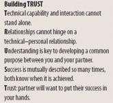 Trust. Mutual success builds trust, and understanding moves to a new level. Your partner continues to more fully explore your technical capability and become more comfortable with the relationship. When the partner has a manufacturing need, they come to you first. Trust leads to further discovery and development of technical capability and the relationship. Your partner will want to work with you and trust you with their success.